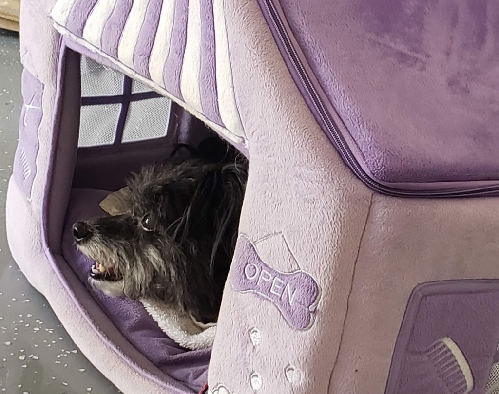 I checked in about this time, as I was headed home. He told me what had happened, but she had since started barking all over again. He said he was going to go get Panda and bring her to our house, “she can be with me while I work on my car in the garage”. I was pulling onto our street at that point and volunteered to go get her. She was indeed still barking. I went inside and she ran to me. I grabbed her “princess bed” along with her leash and off we went to our house. She made me stop along the way to again begin smelling for mom and dad. Once home, I filled a bowl of water she drank some, then snuggled right into her “princess bed”.