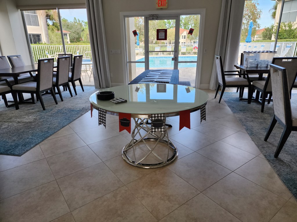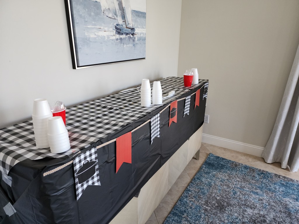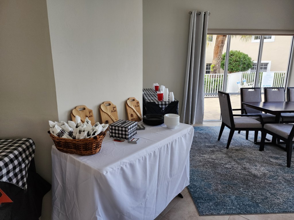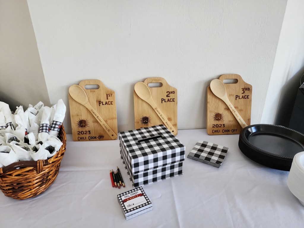 Yesterday a small group of committee members helped to arrange and decorate our clubhouse. We chatted about “traffic flow” to get to the chili, being able to move around to taste everything, having room to mingle while the votes were being tallied, etc. It was fun to watch it all come together. By the way, if you don’t already know, Etsy is a wonderful tool! My gosh, go visit some of those entrepreneurs! I put some photos below of the pre-party decor, thanks to a few wonderful Etsy stores, Chica and Jo and Blue Fire Engraving!