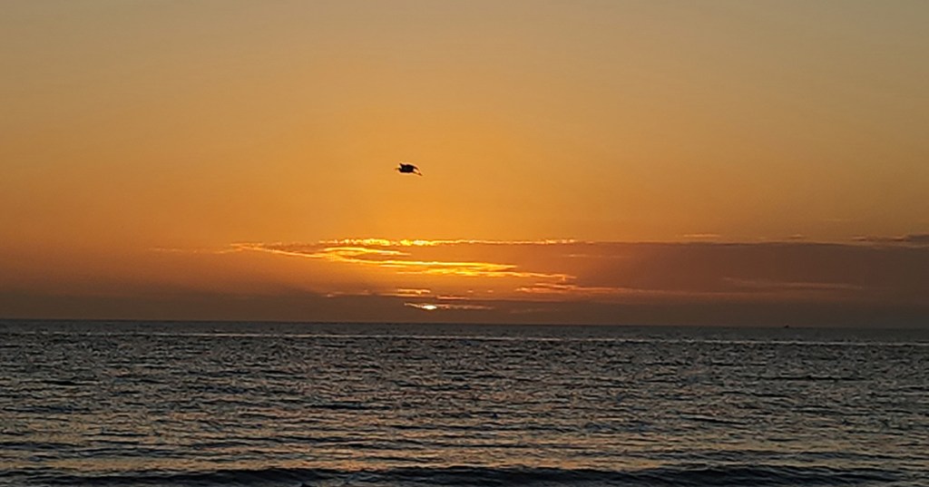 Last night on the way home from work, we stopped at the beach to watch the sunset. I have to admit it was a beautiful evening, with very little wind, and the beach, surprisingly was not that crowded. There were groups of friends who, like us had come down just to watch the sun set over the water. They, like us pulled out their chairs and little tables and settled in.