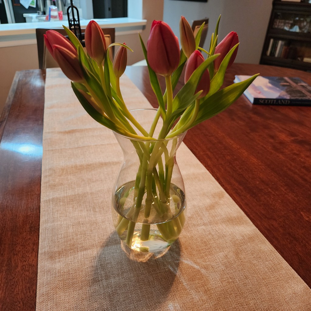 Once home, I carefully trimmed the ends and the excess leaves, and into a simple glass vase they went. If you know tulips, you know that when you place them in the water they are usually drooped over. However, give them a little time and they will be standing straight up. It’s a simple but strong flower for sure, one of God’s beautiful creations.