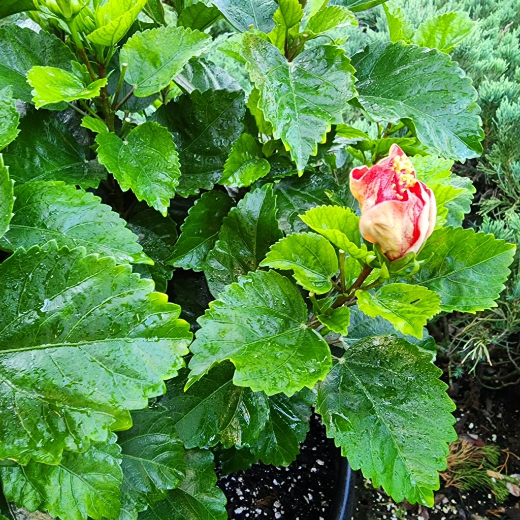 So, I began the process of treating my little hibiscus. Every day, I would pull off the yellow buds; fortunately, the leaves were fine, nice and green. Each morning and evening, I tended to this plant, spraying and treating the soil as the man had instructed. The yellow buds began to disappear, and the green of the outside was returning, but I was still seeing them turn yellow right before they bloomed, grrr… more tending and treatments.